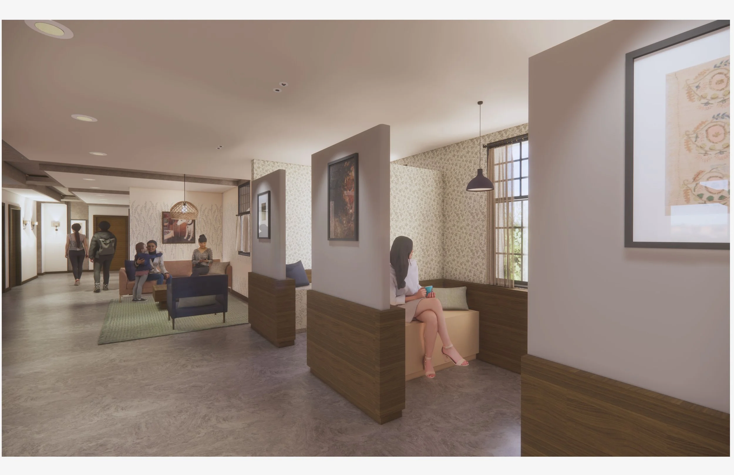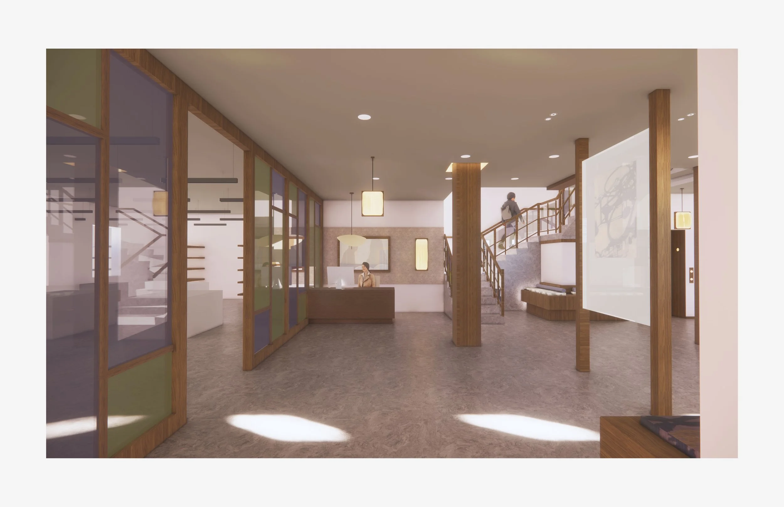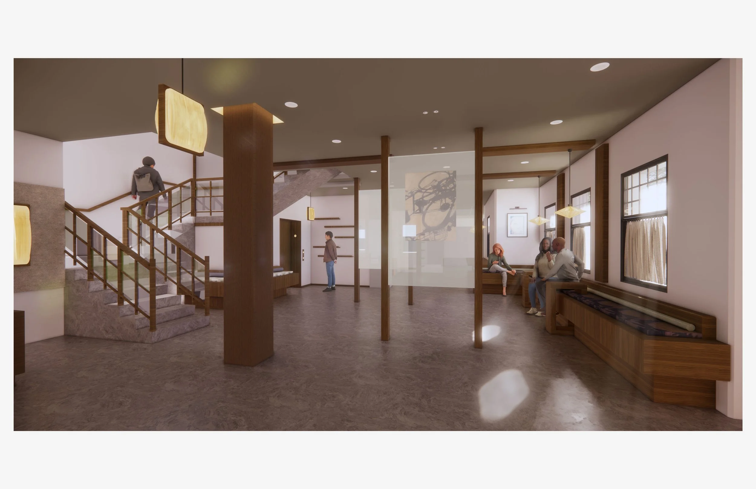This design aims to create a peaceful, safe environment for recovering addicts using design techniques that facilitate privacy and community. The goal was to create a semi-residential feeling in a commercial space in order for the user to be able to let their guard down and continue their healing process. This design relies on the architecture and site of the existing building to influence design decisions and provide an element of nature.